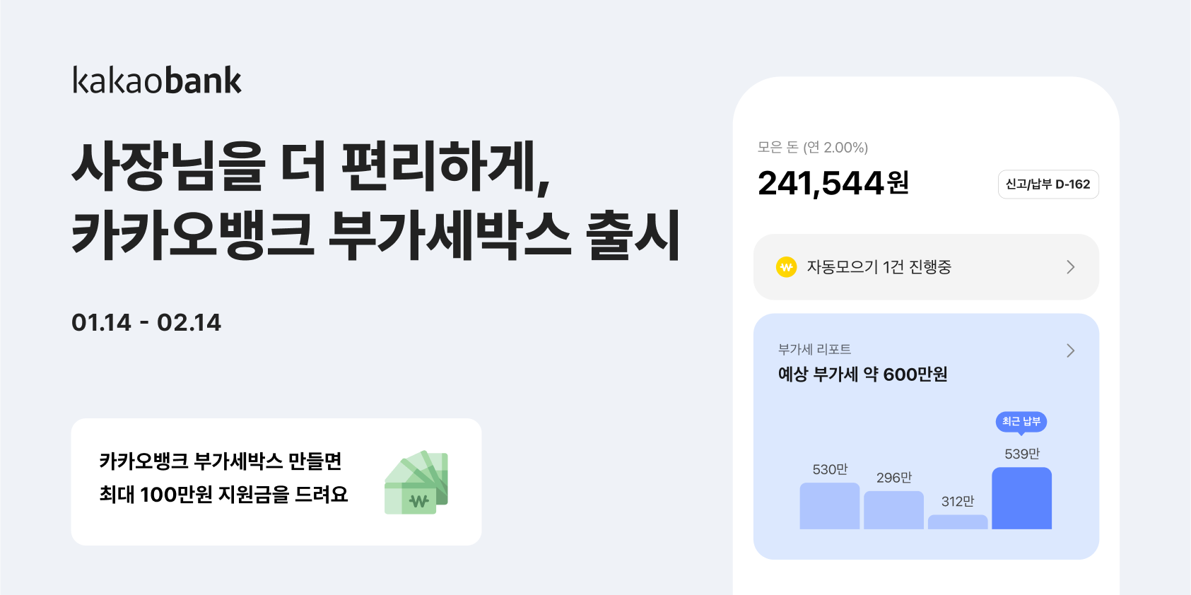 카카오뱅크는 '부가세박스' 출시를 기념해 오는 14일부터 다음 달 14일까지 '부가세박스'를 개설한 고객에게 최대 100만원의 지원금을 제공한다. '부가세박스'를 신규 개설한 모든 개인사업자 고객은 3000원의 지원금을 받을 수 있으며, 추첨을 통해 선정된 10명은 이벤트 종료일 기준 '부가세박스' 잔액의 2배를 최대 100만원 한도 내에서 지원금으로 받게 된다.