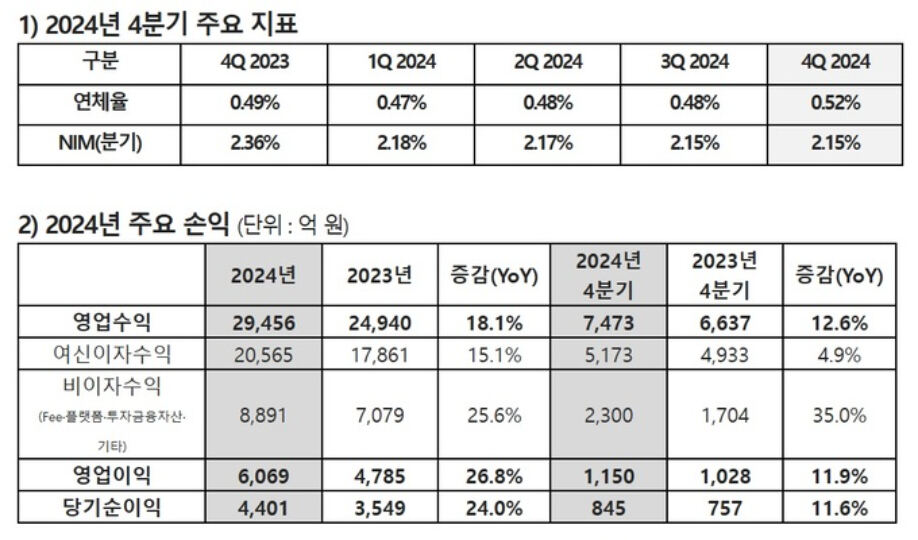 지난해 4분기 영업이익 및 당기순이익은 1150억원, 845억원을 기록했다. 전년 동기 대비 각각 11.9%, 11.6% 증가했다. 4분기 순이자마진(NIM)은 2.15%를 기록했으며, 영업이익경비율(CIR)은 36.4%로 개선됐다.