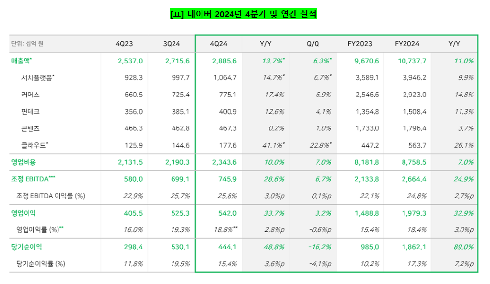 지난해 4분기 매출은 2조8856억원이며 영업익은 5420억원이다. 지난해 같은 기간보다 각각 13.7%, 33.7% 오른 수치다. 네이버는 지난해 전 부문에서 고른 성장을 이어가며 최고 실적을 매 분기 경신했다.