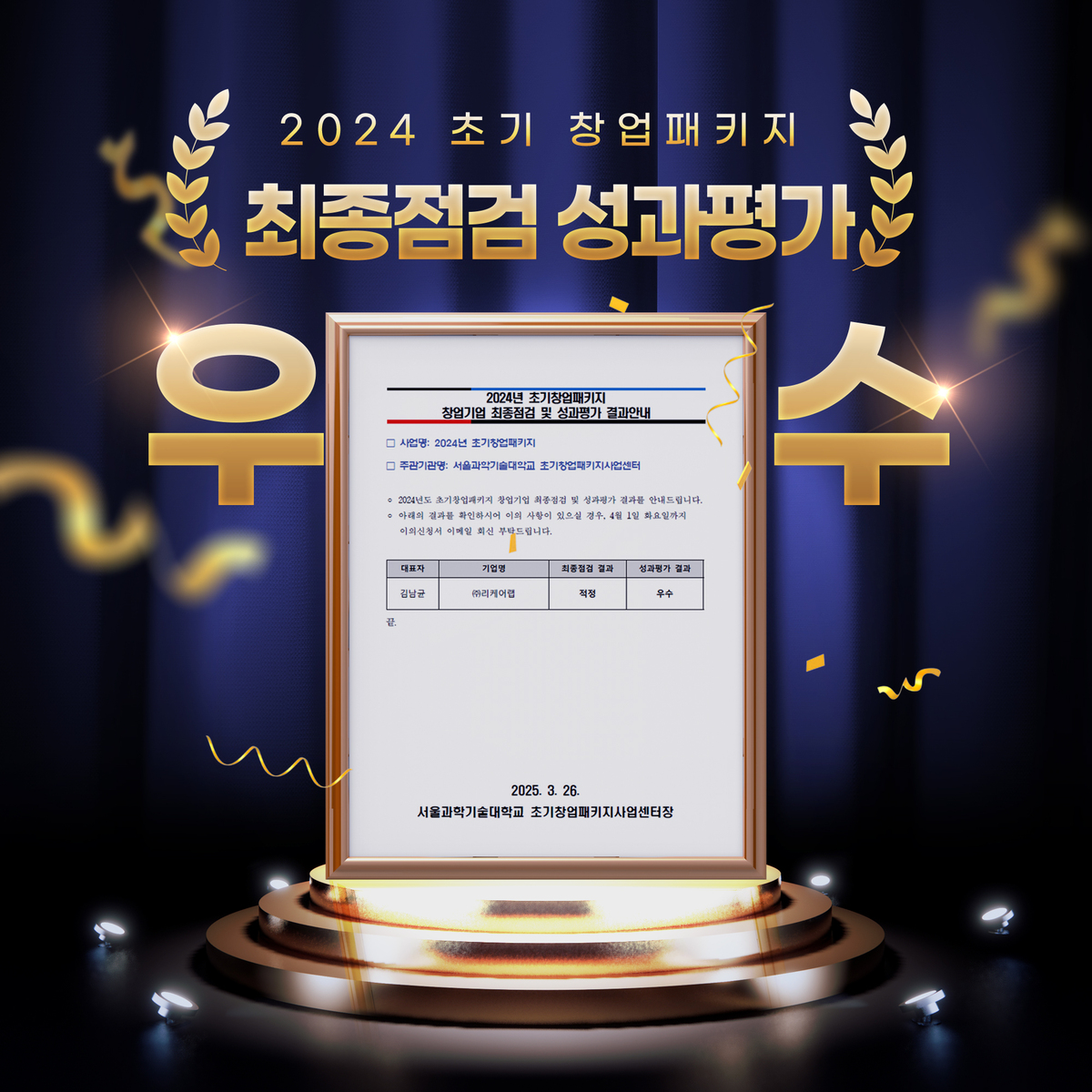 서울과기대 초기창업패키지사업센터는 26일, 2024년도 초기창업패키지에 참여한 창업기업을 대상으로 최종점검과 성과평가 결과를 공고했다. 리케어랩은 이 평가에서 성과평가 ‘우수’ 등급을 받으며 눈에 띄는 성과를 거뒀다.