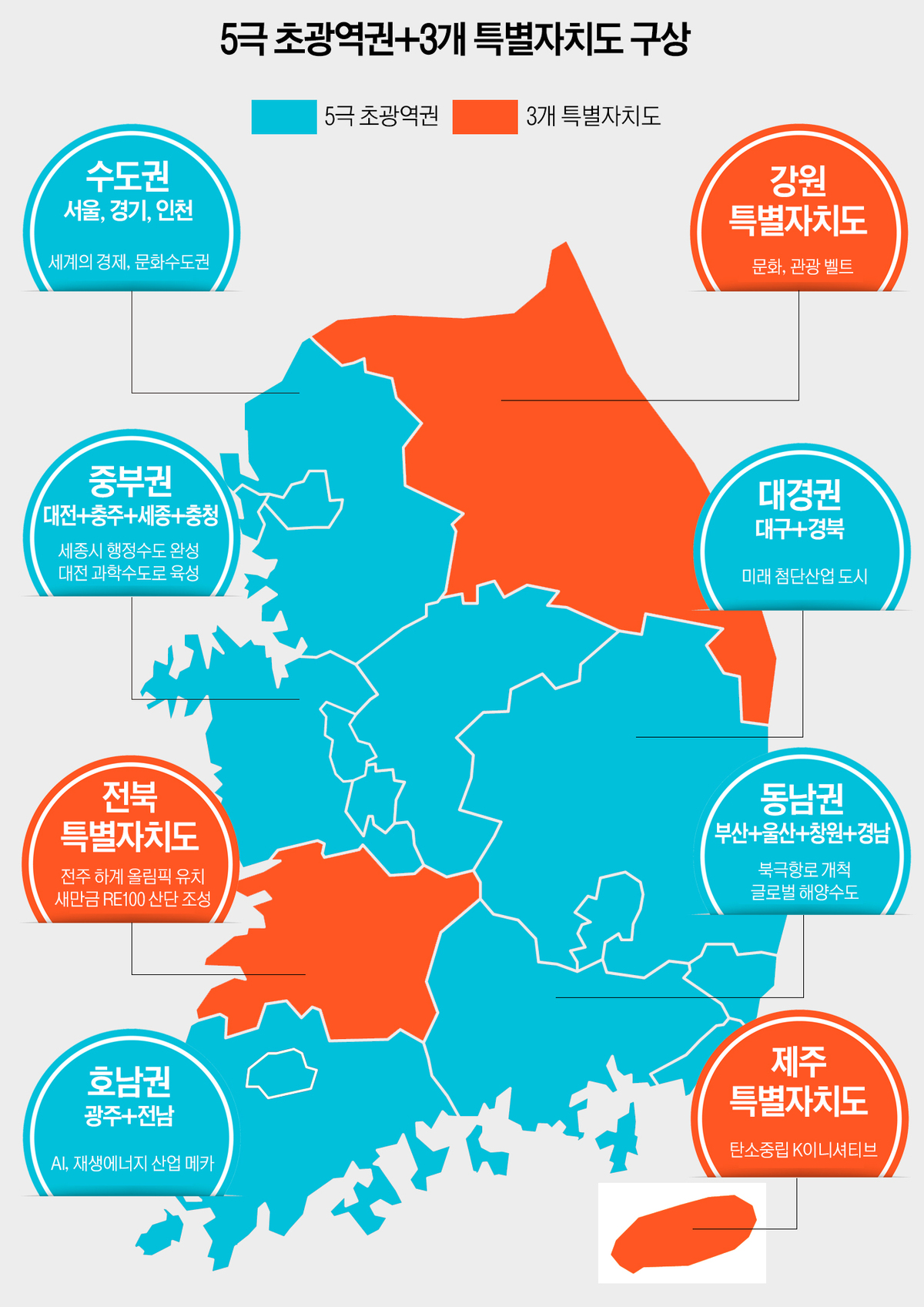이에 이 대통령은 대선 후보 시절부터 수도권 집중도 완화 및 지역 균형발전을 위해 ‘5극 3특’을 주창했다. 최근 국정기획위원회가 보고한 이재명 정부 국정운영 5개년 계획에도 반영된 5극 3특은 5대 초광역권(수도권·동남권·대경권·중부권·호남권)과 3대 특별자치도(제주·강원·전북)마다 혁신·일자리 거점을 조성하고, 전국 광역 교통망을 연계해 지역 간 접근성을 높인다는 정책이다. 이를 통해 잠재성장률 3% 이상, 비수도권 지역내총생산(GRDP) 50% 이상 달성을 꾀한다.