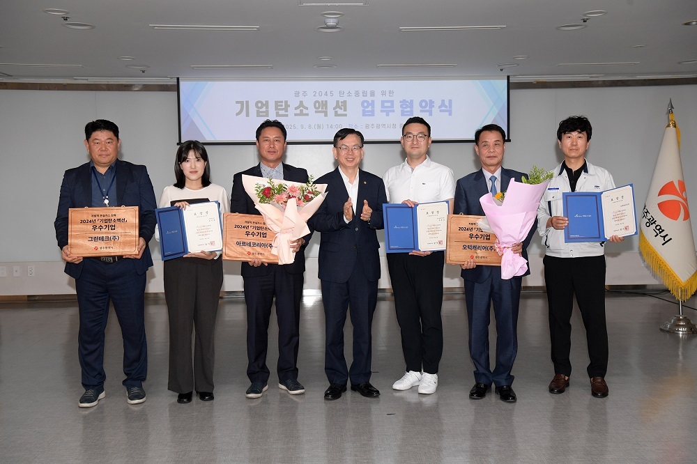 ‘기업탄소액션’은 온실가스 감축 의무가 없는 중소·중견기업이 자발적으로 감축 활동에 참여하고 광주시가 국가 배출권거래제(ETS)를 준용해 마련한 배출권거래시스템에서 모의거래를 통해 성과를 확인하는 제도다. 올해는 참여 기업들의 감축 실적과 이행 활동을 종합적으로 평가해 우수기업을 선정했다.