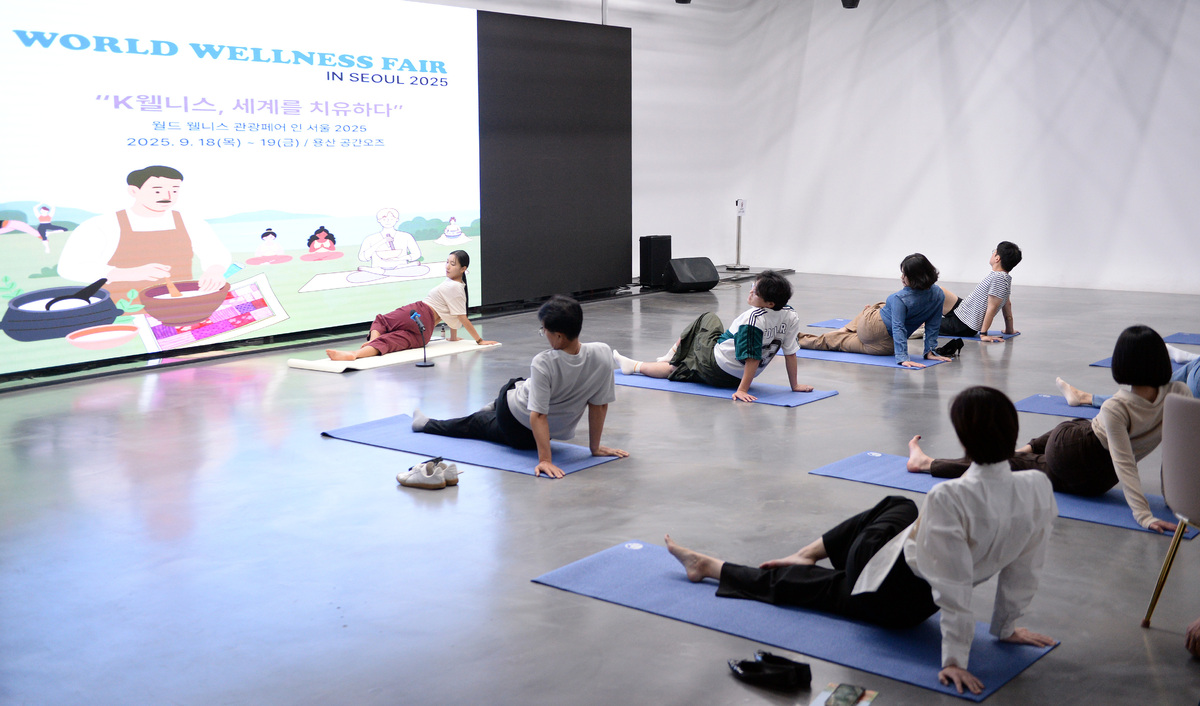 ‘월드 웰니스 관광페어 인 서울 2025’ 첫째날인 18일 서울 용산 공간오즈에서 ‘나의 중심을 찾는 요가&명상’ 프로그램이 최은영 강사(이너마더 타라 대표)의 지도로 진행됐다.
