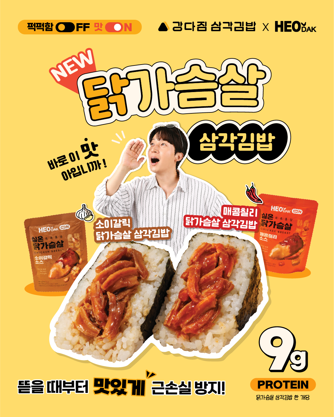 수제 삼각김밥 프랜차이즈 브랜드 강다짐 삼각김밥이 닭가슴살 전문 브랜드 허닭과 손잡고 신메뉴를 선보였다. 이번 협업을 통해 출시된 메뉴는 허닭의 인기 제품 ‘실온 촉촉퐁당 닭가슴살(소이갈릭/매콤칠리)’을 활용한 ▲소이갈릭 닭가슴살 삼각김밥 ▲매콤칠리 닭가슴살 삼각김밥이다.