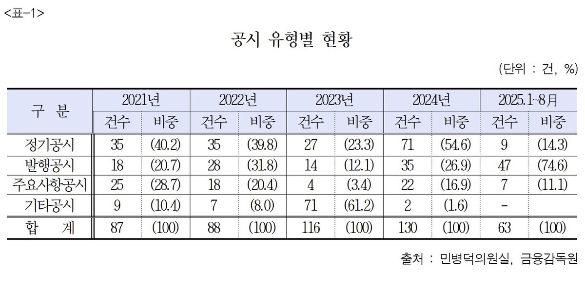 23일 국회 정무위원회 소속 더불어민주당 민병덕 의원이 금융감독원으로부터 제출받은 ‘최근 5 년간 공시위반 조치현황’에 따르면 2021년부터 2025년 8월까지 최근 5년간 상장·비상장법인의 자본시장법상 공시의무 위반 건수는 총 484건에 달했다.