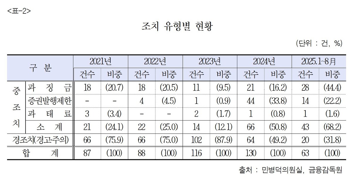 제재 현황을 보면 경고·주의 등 경미한 조치가 5년간 318건으로 전체의 65.7% 를 차지하며 가장 많았다. 과징금은 96건(19.8%), 증권발행제한은 63건(13.0%), 과태료는 7건 (1.4%)에 불과했다.