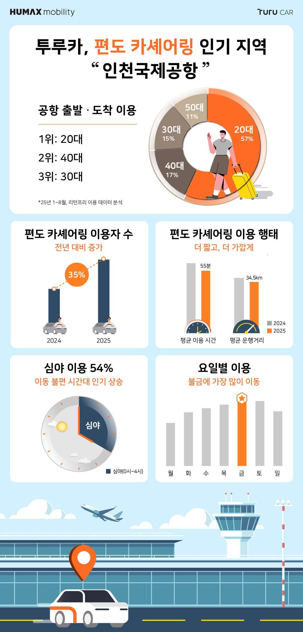종합 모빌리티 기업 휴맥스모빌리티의 카셰어링 브랜드 '투루카(Turu CAR)'는 편도형 카셰어링 서비스 '리턴프리'의 올해 1~8월 이용 현황을 분석한 결과, 인천국제공항과 인접한 거점이 인기 출발지와 도착지로 나타났다고 1일 밝혔다.