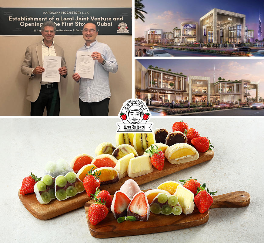 모찌이야기가 아랍에미리트 두바이에 위치한 메리어트 호텔에서 2025년 12월 오픈 예정인 두바이 ‘퍼스트 애비뉴’ 쇼핑몰 내 1호점 출점과 현지 공동 법인 설립을 위한 계약식을 체결하며 주동 시장 공략에 본격 나선다고 2일 밝혔다.