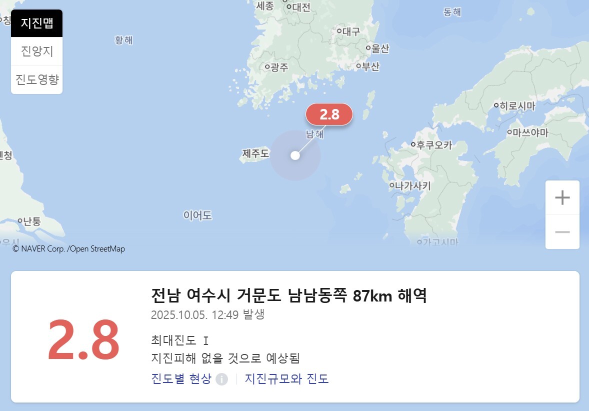 추석 연휴 사흘째인 5일 오후 12시49분쯤 전남 여수시 거문도 남남동쪽 87㎞ 해역에서 규모 2.8 지진이 발생했다.