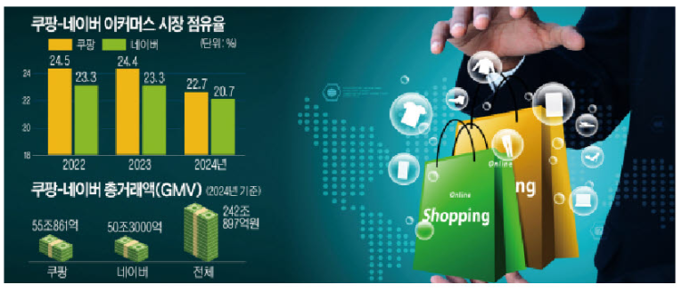 쿠팡과 네이버는 이커머스 시장의 후발주자임에도 현재 선두그룹을 형성했다는 공통점이 있다. 국내 온라인 쇼핑 시장은 1996년 창업한 인터파크에 이어 옥션(1998년), G마켓(1999년) 등이 문을 열면서 형성됐으며 그 뒤 2008년 등장한 11번가에 이어 2010년에 쿠팡이 소셜커머스 업체로 티몬, 위메프 등과 함께 출범했다. 네이버는 2012년 샵N이라는 이름의 오픈마켓 서비스를 시작하며 시장에 합류했다.