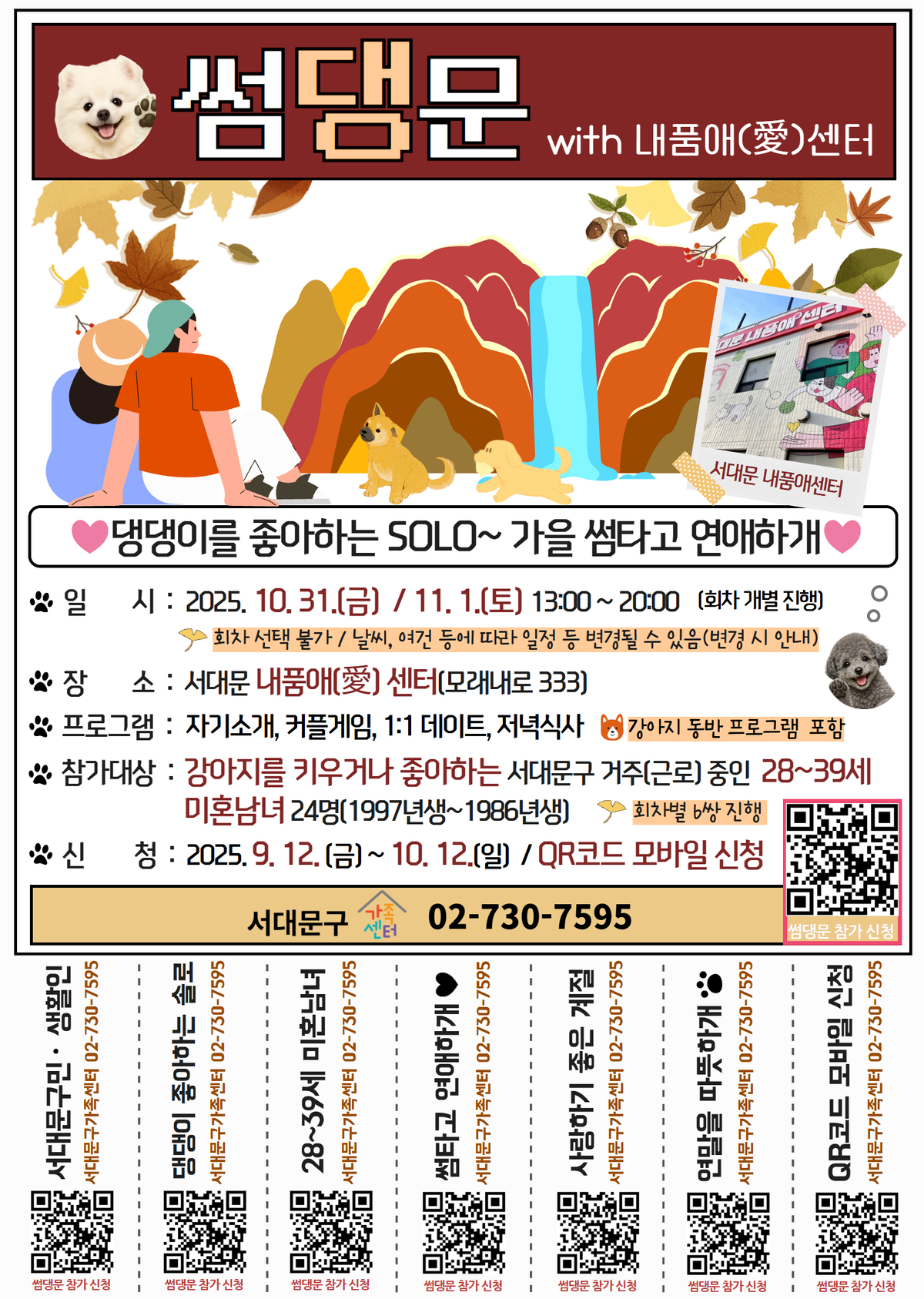 서울 서대문구의 반려동물문화센터 내품애(愛)센터가 깊어가는 가을, ‘연프’ 무대가 된다. 반려견을 사랑하는 20~30대 미혼남녀의 만남을 주선하는 ‘썸댕문 with 내품애센터’가 오는 31일부터 이틀간 열리는 것. 이번 행사를 담당하는 서대문구가족센터 관계자는 “참가자들 사이에서 자연스럽게 공감대가 형성되며 좋은 분위기가 될 것 같다”며 높은 성공률(?)을 자신했다.