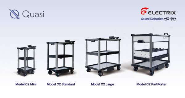 이번에 국내에 공급되는 ‘Quasi C2 시리즈’는 카트형 자율주행로봇으로 △Mini △Standard △Large △PartPorter의 4가지 모델로 구성되어 있으며, 최대 100kg 적재, 제로 회전반경 주행, 3D 센서 기반 실내 맵핑 등 유연한 이동성능을 갖췄다. 가장 큰 특징은 C2 시리즈는 별도의 코딩 없이 3D 센서 기반 맵핑과 웨이포인트 지정만으로 손쉽게 운용할 수 있다는 점으로, 전문 개발 인력이 없는 병원·약국·연구소·전자조립 공정 등에서도 누구나 쉽고 간편하게 물류 자동화를 구현할 수 있다.