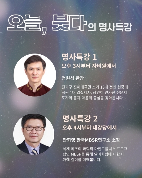 특히 태극권의 뿌리를 잇는 정원석 관장의 태극권 체험과 한국 MBSR(마음챙김 기반 스트레스 감소)의 분야의 선구자인 안희영 박사의 ‘알아차림 탐구’ 특강이 준비되어 있어 참여자들이 몸과 마음의 이완과 성찰을 깊이 체험할 수 있을 것으로 기대된다.