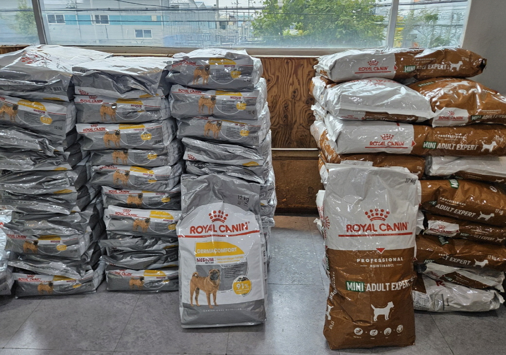 로얄캐닌코리아가 부산 지역 동물보호단체에 기부한 사료들. 로얄캐닌코리아 제공