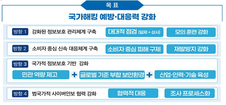 과학기술정보통신부는 이러한 내용의 범부처 정보보호 종합대책을 마련했다고 22일 밝혔다. 이 대책은 국가안보실을 중심으로 과기정통부, 금융위원회, 개인정보보호위원회, 국가정보원, 행정안전부 등 관계부처가 함께 실행할 수 있는 단기과제 위주로 제시됐다. 이후 중장기 과제를 총괄하는 국가 사이버안보 전략도 연내 수립할 계획이다.