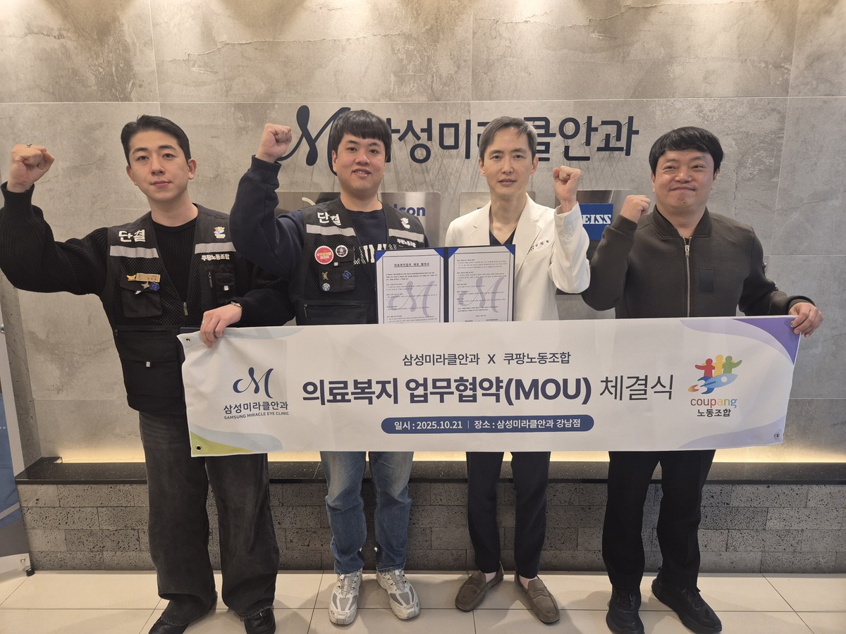 삼성미라클안과(대표원장 김진철)는 지난 21일, 쿠팡노동조합(위원장 정진영)과 조합원 복지 향상을 위한 의료서비스 업무협약(MOU)을 체결했다고 밝혔다. 이번 협약을 통해 조합원 및 그 가족들은 정밀 안과검진 지원, 시력교정 수술 우대 혜택, 예약 우선 배정 등 다양한 의료서비스를 제공받게 된다.