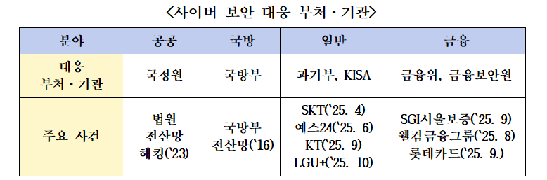그러나 공공과 민간 부문의 통합적 대응을 위한 체계가 갖춰지지 않아 광범위한 사이버 공격에 효율적인 대처가 불가하다는 지적이 제기돼 왔다. 현재 국가정보원이 공공 분야를, 국방부 사이버작전사령부가 국방 분야를, 과학기술정보통신부와 한국인터넷진흥원(KISA)이 일반 기업 등 민간 분야를, 금융위원회와 금융보안원이 금융 분야 사이버 보안을 각기 전담하고 있다.