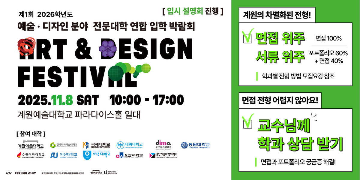 계원예술대학교 관계자는 “이번 행사는 예술·디자인 전문대학이 협력해 수험생에게 보다 깊이 있는 정보를 제공하는 데 초점을 맞췄다”며 “입시상담을 넘어 예술을 직접 체험하며 진로를 탐색할 수 있는 기회를 제공할 것”이라고 말했다.