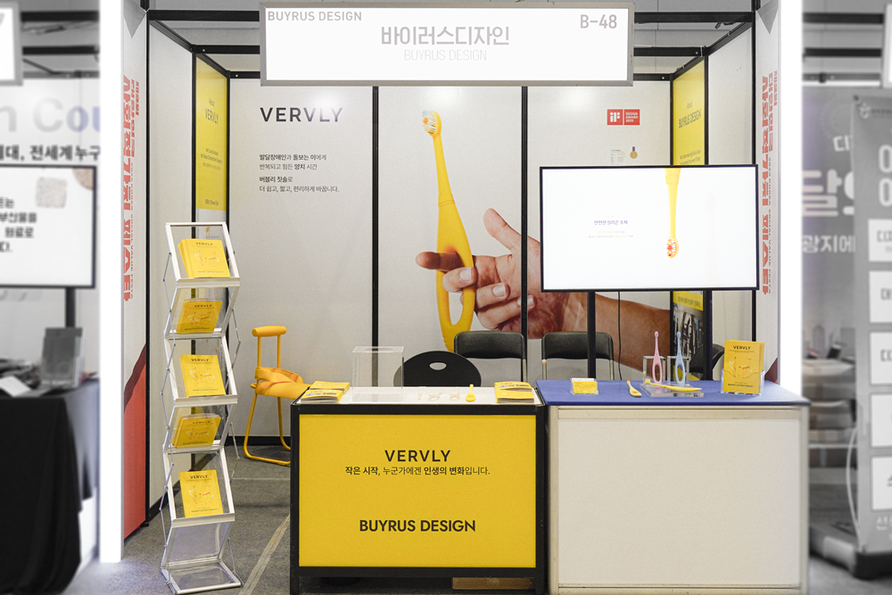 바이러스디자인이 개발한 칫솔 ‘버블리(VERVLY)’ 양치가 어려운 발달장애인을 대상으로 보호자가 효율적으로 양치를 수행할 수 있도록 설계된 칫솔이다.