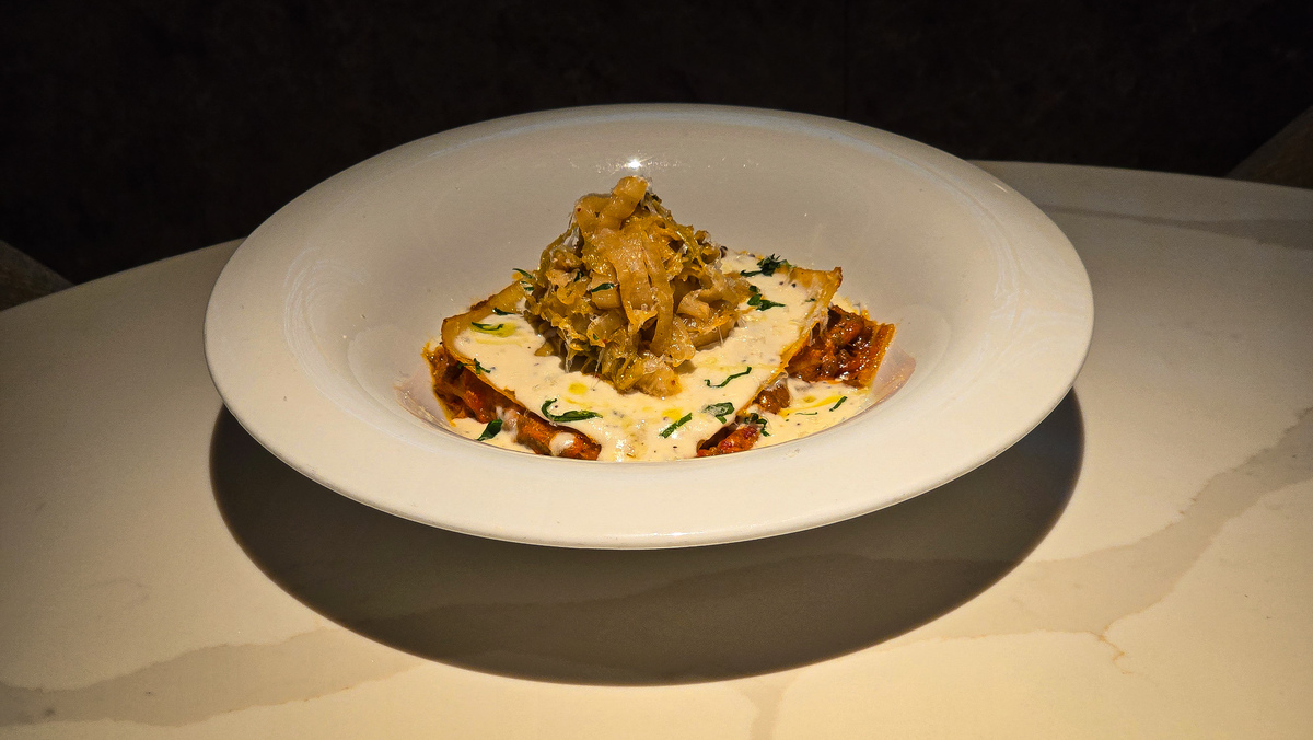 김치 라구 라자냐는 라자냐 특유의 ‘겹의 텍스처’와 김치의 식감을 동시에 살린 메뉴다. 김치를 일반적인 라구처럼 완전히 익혀 부드럽게 만들기보다 잘게 다지되 식감이 남도록 조절한 ‘김치라구’를 만들었다. 김치와 라구의 농도, 수분, 발효 향까지 세밀하게 조율해 두 식감이 충돌하지 않고 자연스럽게 포개지도록 다듬은 게 핵심이다.