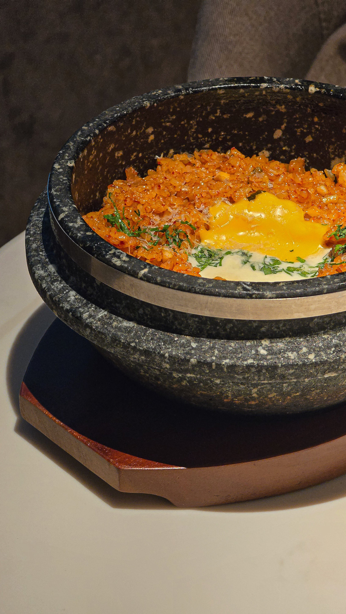 깍두기의 아삭함과 발효 산미가 크림의 부드러움이 만난 감각적인 조합의 돌솥밥이다. 특징은 밥과 함께 씹히는 깍두기의 맛. 이는 시식 단계부터 ‘씹히는 맛이 좋다’는 반응을 얻었다고. 요즘 유행하는 크림 깍두기 볶음밥을 좀 더 품격있게 재해석한 메뉴다.
