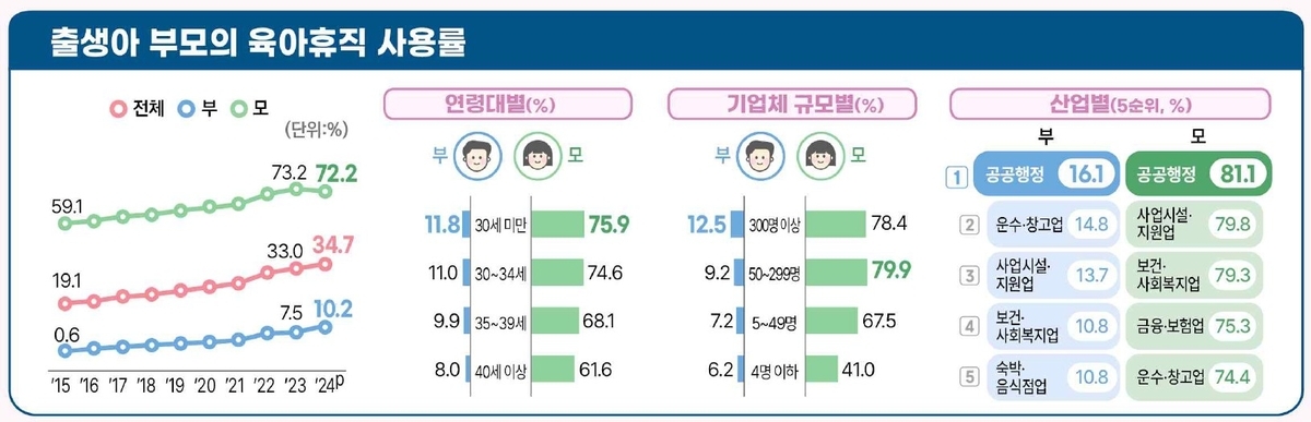 지난해 태어난 아기 부모의 지난해 육아휴직 사용률은 34.7%로, 1.7%포인트 높아졌다. 특히 아빠의 육아휴직 사용률이 10.2%로, 처음 10%를 넘어섰다.