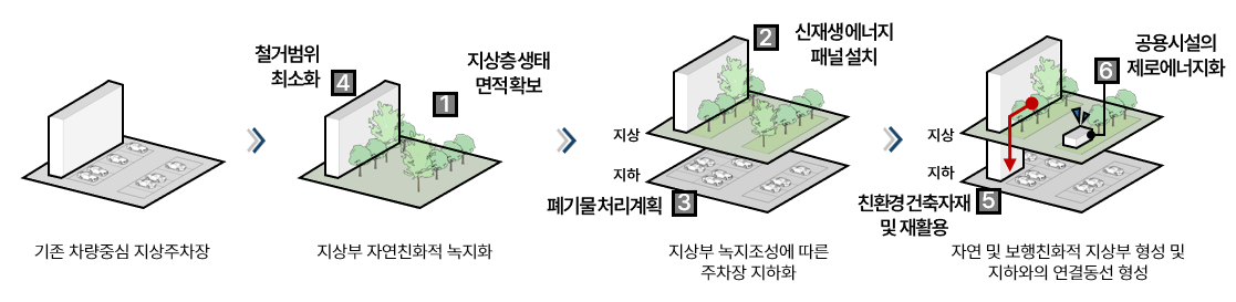 이에 따라 용적률은 243.63%로 상향됐다. 세대 수는 기존 498세대에서 572세대로, 74세대가 증가했다. 기존 철근콘크리트 구조를 유지한 상태에서 증축하는 방식으로 세대 수를 확장했다. 주차장은 기존 지상 구조에서 지하 주차 중심 구조로 변경됐다. 지하 주차장은 총 703대를 수용할 수 있는 공간으로 확대되면서 세대당 주차 대수는 1.23대로 확보됐다. 차량 동선과 주차 기능이 지하로 이전되면서 지상부의 차량 이용 공간이 해소됐다. 확보된 지상 공간은 보행자를 위한 녹지 공간으로 재구성됐다.