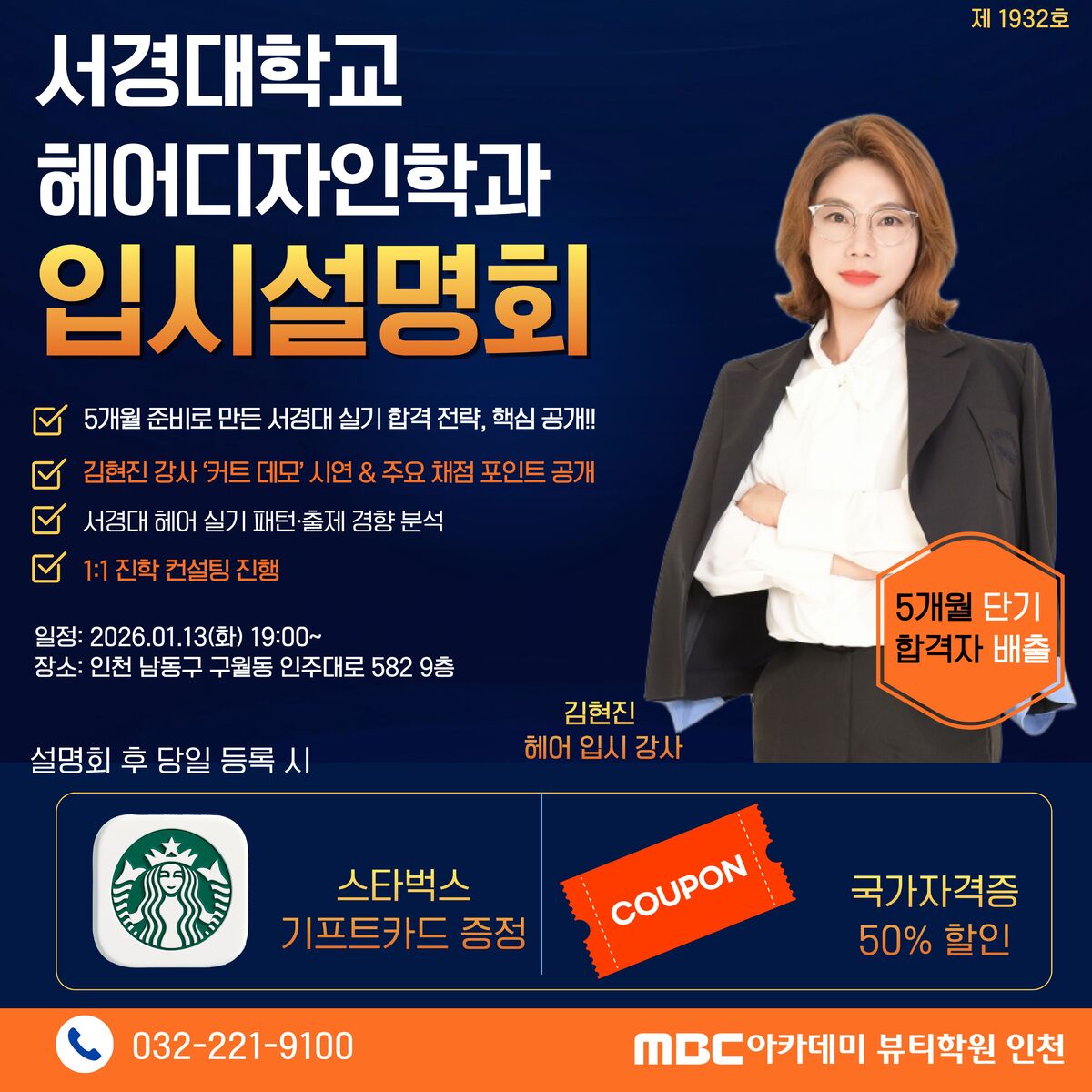 MBC아카데미뷰티학원 인천점이 오는 2026년 1월 13일 오후 7시 서경대학교 헤어디자인학과 입시설명회를 개최한다고 7일 밝혔다.