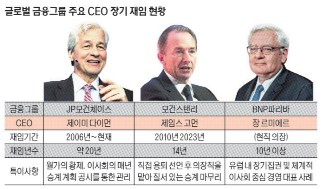 이는 글로벌 금융그룹의 지배구조와 뚜렷한 대비를 보인다. 미국 JP모건체이스나 모건스탠리 등은 CEO가 10년 이상 장기 재임하더라도 이사회 중심의 견제 장치와 투명한 승계 프로그램을 통해 ‘관리된 장기집권’을 제도화하고 있다.