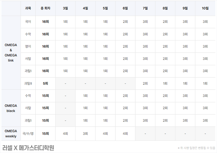 OMEGA 모의고사 및 시행 일정에 대한 자세한 내용은 학원 홈페이지를 통해 확인할 수 있다.