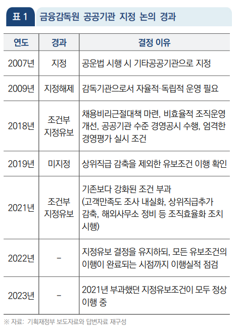 입법조사처는 공공기관 지정이 경영평가와 경영공시를 통해 조직의 투명성을 높이고 외부 감시를 강화하는 효과가 있을 수 있는 반면, 경영평가 지표에 맞춘 단기 성과 중심의 운영으로 흐를 경우 금융시스템 안정과 금융소비자 보호라는 본래 목적이 충분히 반영되지 못할 위험이 있다고 분석했다. 이에 따라 공공기관 지정 여부와 별도로 금감원의 자율성과 독립성을 전제로 한 책임성 강화 방안을 병행해야 한다고 강조했다.