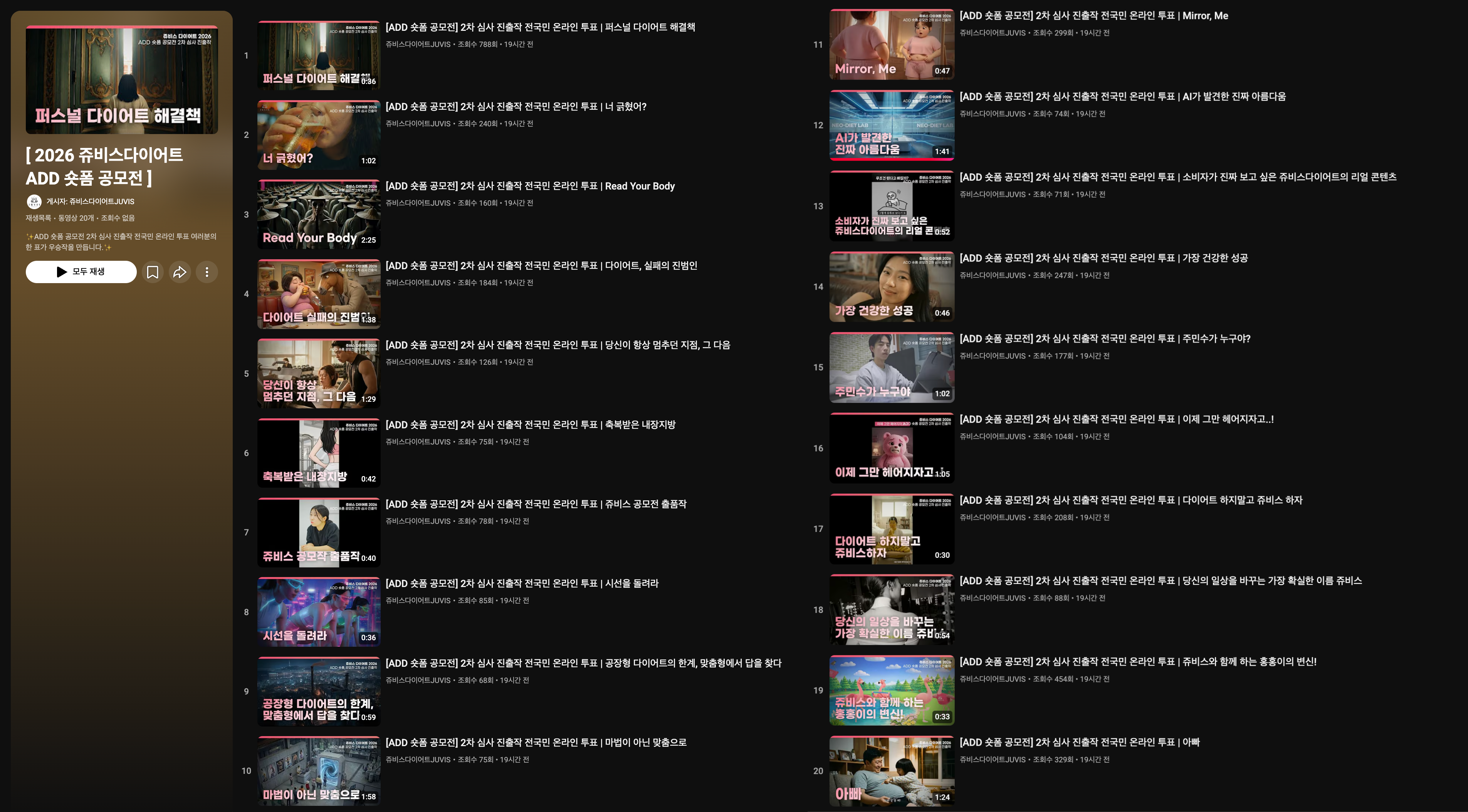 이번에 선정된 20편은 지난 9일 진행된 쥬비스다이어트 내부 심사를 통해 결정됐으며, 같은 날 쥬비스다이어트 공식 유튜브 채널에 공개됐다. 최종 수상작은 오는 28일까지 진행되는 2차 심사를 통해 가려진다.