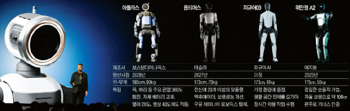 현대자동차가 지분을 인수한 보스턴다이내믹스의 ‘아틀라스’도 가장 발전된 이족보행 휴머노이드 로봇으로 평가받는다. 2013년 초기 모델이 공개된 이후 발전을 거듭한 결과, 지난달 공개된 양산형 아틀라스는 50㎏ 무게를 들 수 있고 30㎏ 무게를 든 채 이동할 수 있다. 스스로 배터리를 교체할 수도 있다. 특히 완성차 조립 공장에서 의장(세밀한 조립)도 가능하다는 평가를 받고 있다. 기존 고정식 기계보다 훨씬 유연한 만큼 수백 개의 작은 나사와 배선이 얽혀있는 하부 작업도 가능하다.