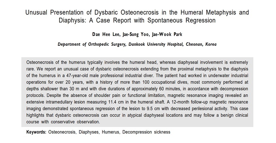 이압성 골괴사(Dysbaric Osteonecrosis)는 일반적으로 잠수병과 연관되어 대퇴골이나 상완골 근위부 관절면에서 발생하는 것으로 알려져 있다. 그러나 이번 발표는 비교적 드물게 보고되는 상완골 골간(metaphysis) 및 간부(diaphysis)에 발생한 증례를 다뤘다는 점에서 학계의 주목을 받았다.