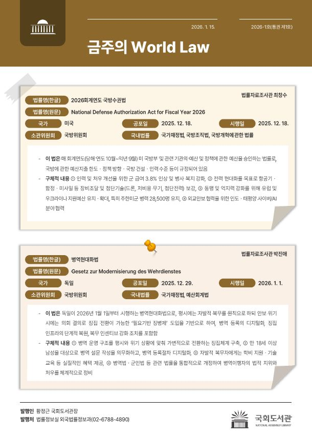 금주의 World Law에서 소개한 법률의 원문과 상세 내용은 국회도서관 의회법률정보포털에 접속한 뒤, 상단 메뉴의 ‘법률정보’ → ‘주요국 입법자료’에서 확인할 수 있다. 해당 자료는 매주 국회의원실과 국회사무처 등 국회 소속기관 전체에 배포된다.