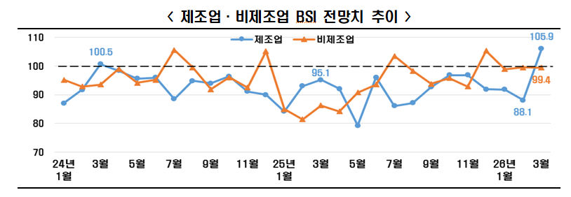 제조업 BSI 전망치는 전월(88.1) 대비 17.8포인트 상승한 105.9를 기록했다. 2024년 3월(100.5) 이후 2년 만에 긍정으로 돌아선 것이다. 이번 전망치는 2021년 5월(108.6) 이후 4년 10개월 만에 가장 높은 수준이다. 비제조업 전망치(99.4)는 기준선 100에 소폭 미달하며 부정 전망을 보였다.