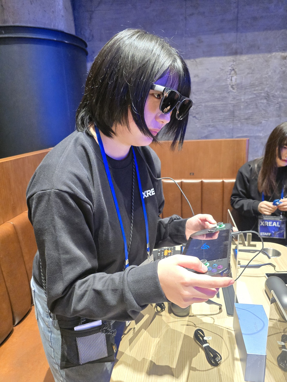 기자가 행사장에서 1S를 쓰고 게임을 실행하자 선명하고 넓은 화면이 나타났다. 1S 우측의 버튼을 통해 화면 고정 기능을 켠 후 고개를 상하좌우로 움직였더니 고정된 화면이 안정적인 느낌을 줬다. 엑스리얼 관계자는 “사용자가 머리를 움직여도 화면은 공간상 고정된 위치에 유지되며, 120Hz 주사율과 3ms의 초저지연을 구현해 몰입감을 극대화한다”고 설명했다.