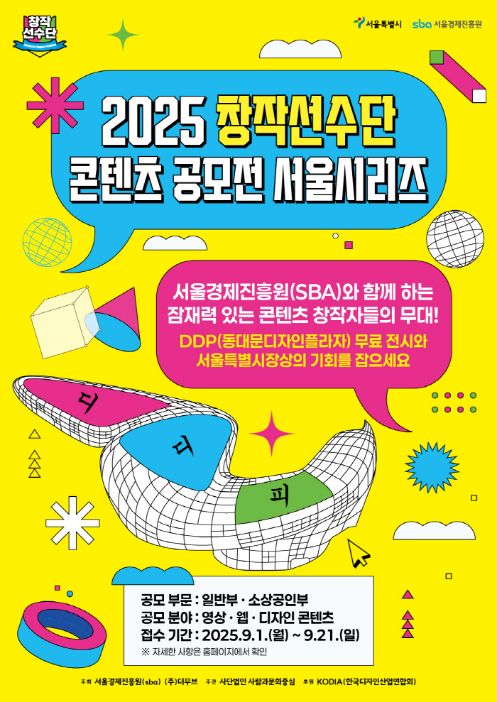 서울경제진흥원(SBA)과 ㈜더무브가 공동 주최하고 사단법인 사람과문화중심이 주관, 사단법인 한국디자인산업연합회(KODIA)가 후원하는 ‘2025 창작선수단 콘텐츠 공모전 서울시리즈’가 참가자를 모집 중에 있다고 8일 밝혔다.