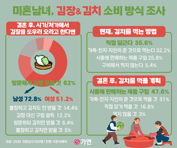 가연은 이번 조사를 통해 ‘김장과 김치 소비 방식’에 대한 미혼남녀의 인식을 알아봤다. (2539남녀 500명 대상, 오픈서베이 진행, 신뢰수준 95%, 표본오차 ±4.38%P)