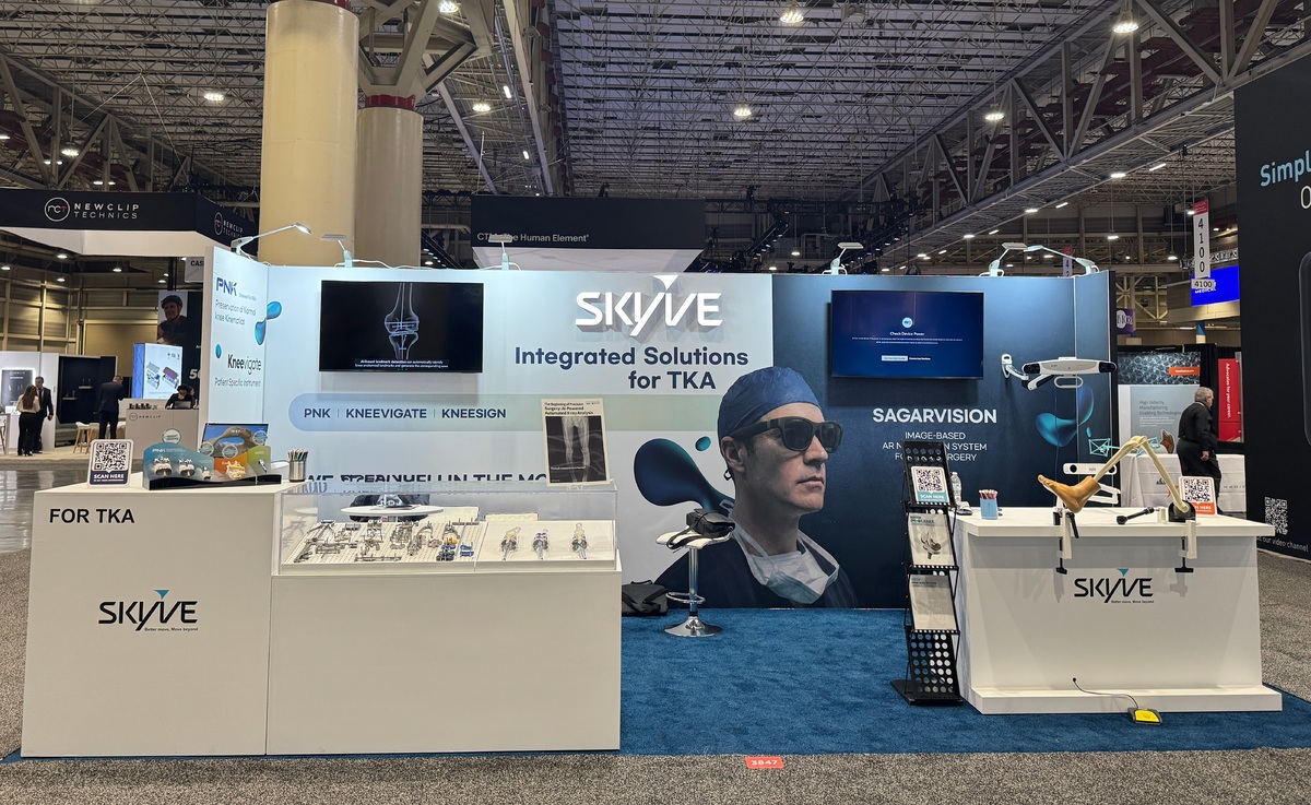 이번 전시에서 스카이브는 미국 FDA 510(k) 승인을 받은 인공무릎관절 시스템 ‘PNK’를 핵심 제품으로 소개했다. 여기에 더해 지난해 행사에서 높은 관심을 받았던 AR 글라스 기반 수술 가이드도 함께 선보였다. 스카이브 측에 따르면 특히 올해는 각각의 개별 기술을 단순히 나열하는 전시를 넘어, 환자 맞춤형 수술의 모든 단계를 연결하는 ‘통합 플랫폼’ 형태로 솔루션을 구성한 것이 특징이다.