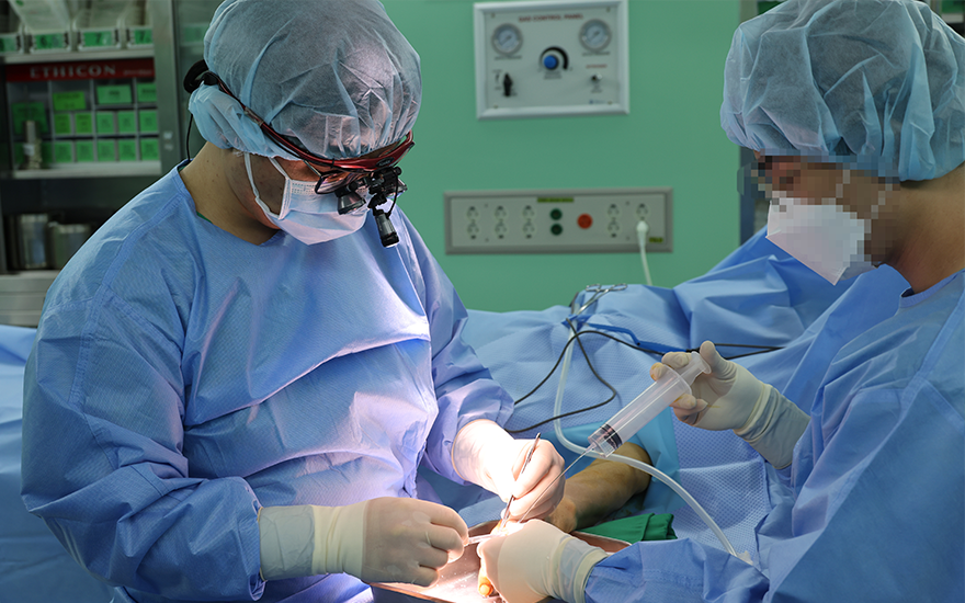 이후 환자가 안정된 상태에서 신경 손상의 정도를 정밀히 평가한 결과, 예상보다 더 광범위한 신경 손상이 확인됐다. 어깨 아래의 거의 모든 신경이 마비돼 팔꿈치, 손목, 손가락을 전혀 움직일 수 없는 상태였다. 이를 극복하기 위해 환자의 다리 뒤쪽에서 상대적으로 중요도가 낮은 감각신경을 채취해 팔과 손의 운동신경을 재건하는 수술에 나섰다.