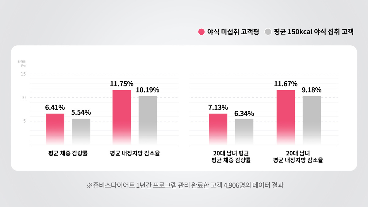 실제 최근 1년간 관리 데이터를 보면, 주 2회 야식을 섭취한 그룹과 그렇지 않은 그룹 간 체중 감량 효율 차이가 확인됐다. 야식을 하지 않은 경우 평균 감량률은 6.41%, 섭취한 경우는 5.54%로 약 0.87%p 차이를 보였다. 내장지방 감소율 역시 각각 11.75%와 10.19%로 차이가 나타났다.