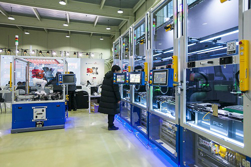 | SK텔레콤은 20일 경기도 안산시에 위치한 `스마트제조혁신센터(SMIC)`에서 5세대 이동통신(5G) 스마트팩토리 솔루션을 공개했다. 생산라인을 마치 블록 쌓듯 만들 수 있는 5G 스마트 유연생산 설비의 모습. |