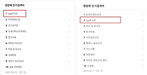 [세계비즈=박혜선 기자] 최근 RGG유산균에 대한 관심이 증가하면서 네이버 영양제 인기 검색어에서 1, 2위를 차지했다.