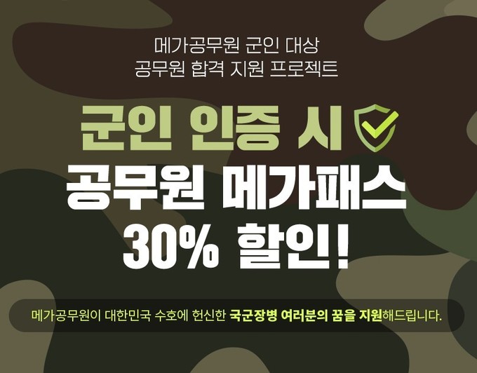 이번 프로모션은 군 생활 중 꿈을 위해 도전하는 국군장병들을 지원하기 위해 마련된 이벤트다. 대한민국 현역 군인 또는 전역 1개월 이내 해당되는 전역 군인에게 공무원 메가패스 30% 할인권을 제공한다고 업체 측은 전했다.