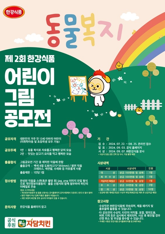 한강식품이 주관하고 자담치킨이 후원하는 이번 공모전은 대한민국에 거주하는 만 13세 이하의 어린이라면 누구나 참여 가능하다. 공모주제는 ‘동물복지로 자유롭고 행복한 닭의 모습’ 또는 ‘맛있는 닭고기 요리를 먹고 행복한 모습’ 2개의 주제 중 선호하는 주제로 출품하면 된다. 출품작은 8월 25일까지 온라인으로 접수하면 된다.
