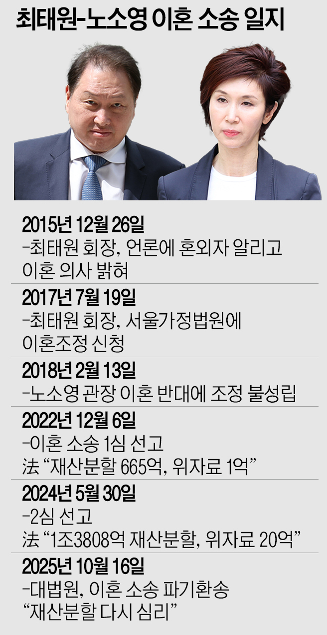 그러나 항소심은 지난해 5월 “노 관장이 SK의 성장 과정에서 일정 부분 기여했다”고 판단, 최 회장에게 재산분할금 1조3808억 원과 위자료 20억 원 지급을 명령했다. 이번 대법원 판결로 해당 재산분할액은 다시 산정 절차를 거치게 된다.