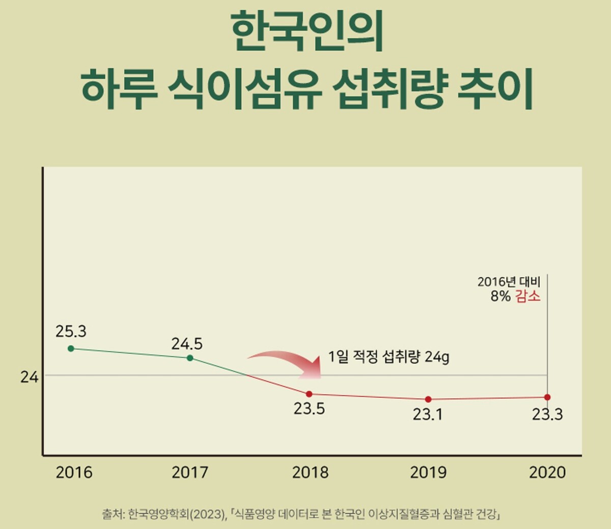 최근 식습관의 서구화로 국내 성인의 하루 평균 식이섬유 섭취량이 권장 수준에 미치지 못하는 것으로 나타났다. 한국영양학회에 따르면 우리나라 성인의 식이섬유 하루 평균 섭취량은 남성 약 26g, 여성 약 22g 수준으로 세계보건기구(WHO)와 여러 국제기구가 제시하는 권장 섭취량(약 25~40g)에 못 미치는 수준이다.