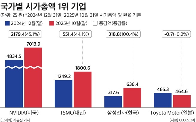 미국의 시총 증가율은 20.9%로 4개국 중 가장 낮았지만 상위 10개사 시총은 모두 1000조원을 넘었다. 미국 1위 엔비디아의 시총은 삼성전자의 11배에 달했다.