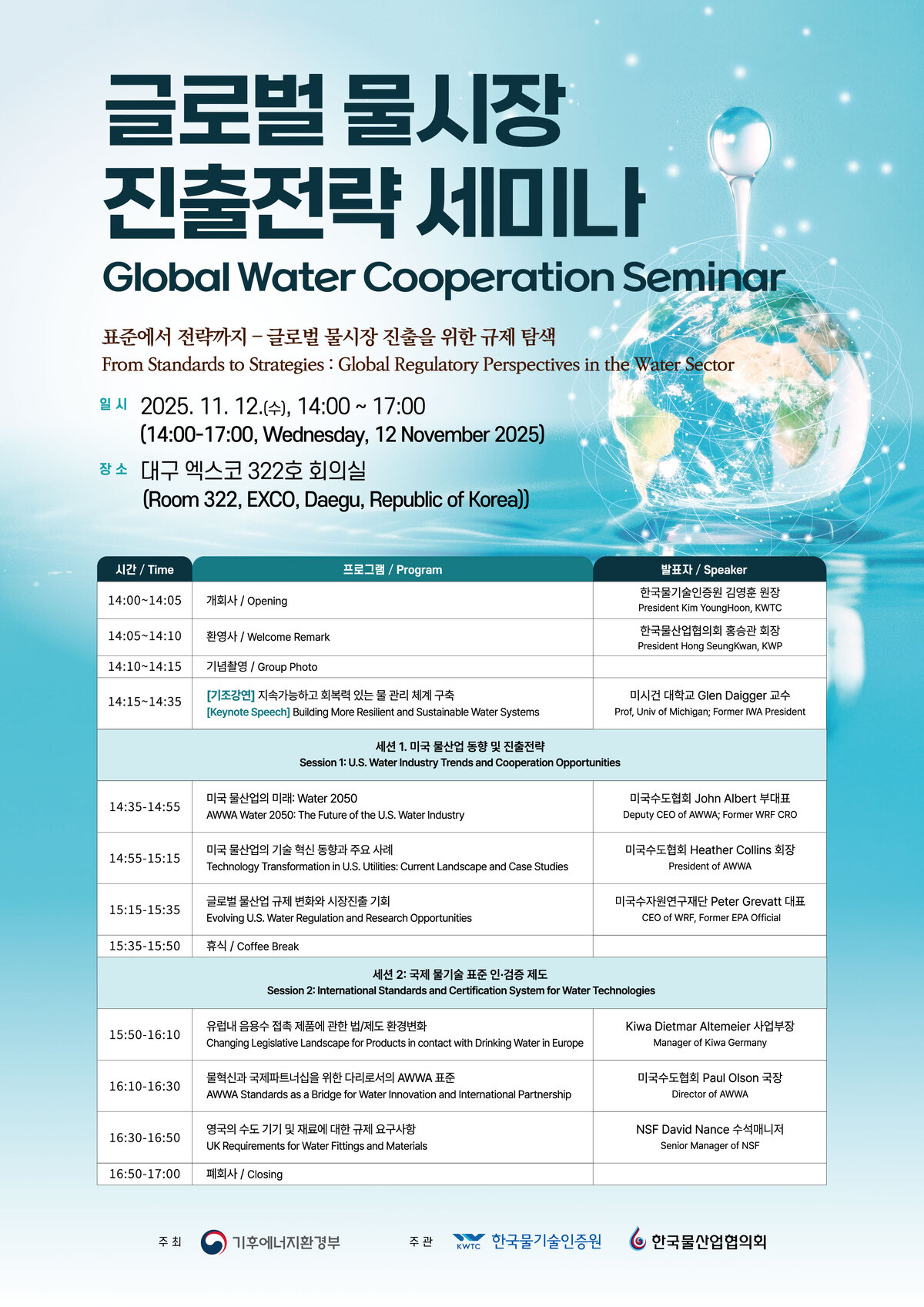 2025년 대한민국 국제물주간(KIWW)과 연계하여 글로벌 물산업의 최신 규제 동향과 인증제도 정보를 공유하는 「글로벌 물시장 진출 전략 세미나」를 한국물기술인증원과 한국물산업협의회가 공동으로 개최합니다.